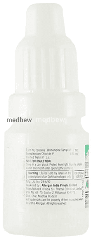 Alphagan Eye Drop is used in the treatment of ocular hypertension (pressure in the eye) and glaucoma. It helps to lower high pressure in the eye and reduces the risk of vision loss. This medicine may be used alone or in combination with another eye drop that reduces pressure in the eye.
