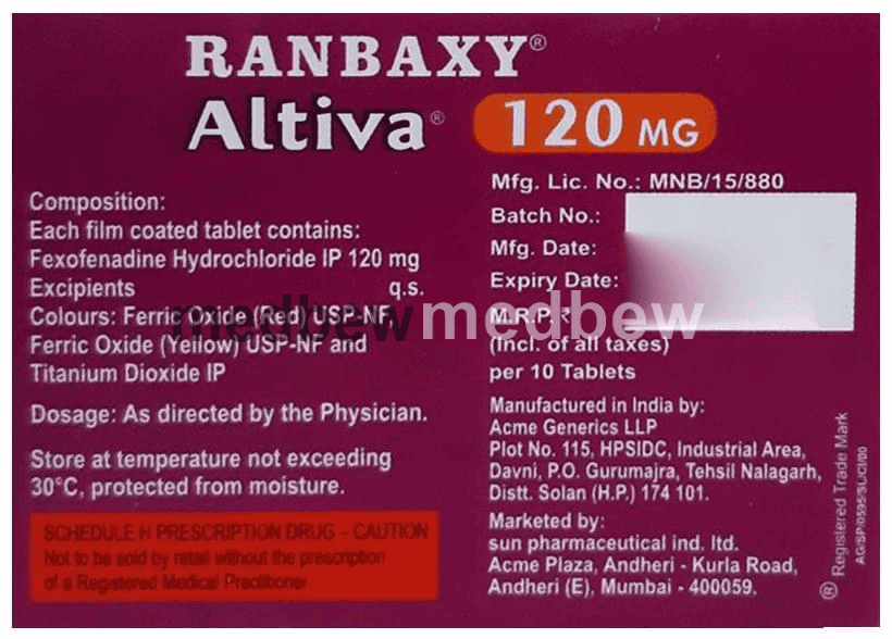 Altiva 120mg Tablet is an anti-allergy medicine used in the treatment of allergic symptoms such as runny nose, congestion or stuffiness, sneezing, itching, swelling, and watery eyes. It also helps treat skin allergies with itching, redness, or swelling.
