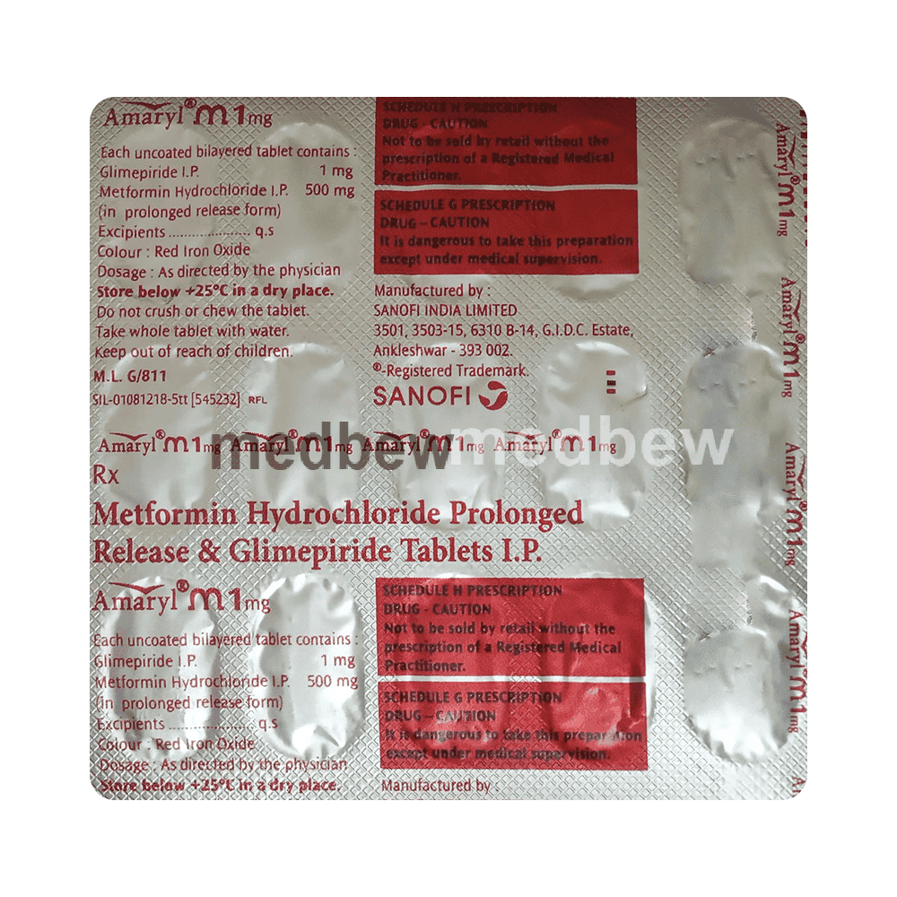 Amaryl M 1mg Tablet PR belongs to a category of medicines known as anti-diabetic drugs. It is a combination of two medicines used to treat type 2 diabetes mellitus in adults. It helps control blood sugar levels in people with diabetes.