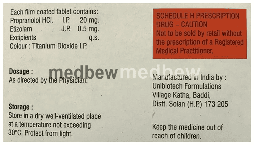 Composition Etizolam (0.5mg) + Propranolol (20mg)