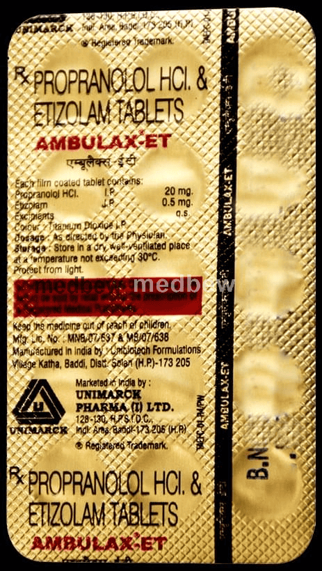 Ambulax-ET Tablet is a combination of two medicines: Etizolam and Propranolol. Etizolam is a benzodiazepine. It works by increasing the action of GABA, a chemical messenger which suppresses the abnormal and excessive activity of the nerve cells in brain. Propranolol is a beta blocker which blocks the action of certain chemical messengers on the heart and blood vessels. This reduces heart rate, blood pressure, and strain on the heart.