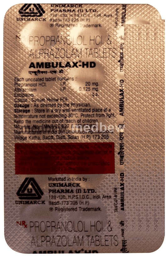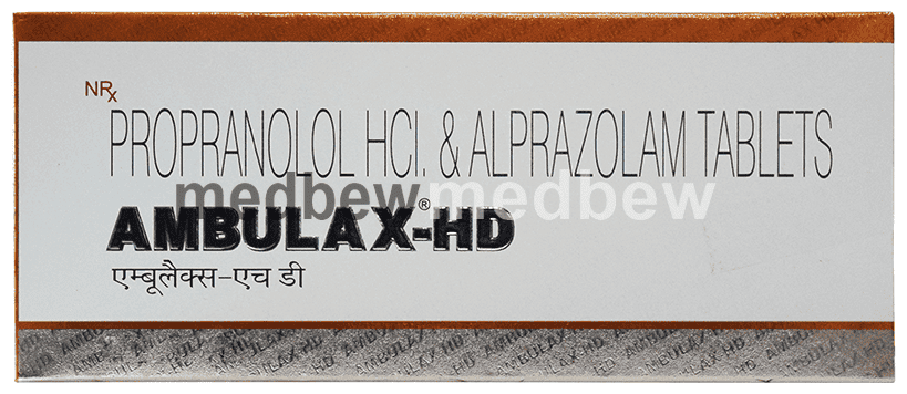Ambulax-HD Tablet is a prescription medicine used to treat anxiety. It calms the brain by decreasing the abnormal and excessive activity of the nerve cells. It also blocks the action of certain chemical messengers on the heart and blood vessels. This reduces heart rate and blood pressure.