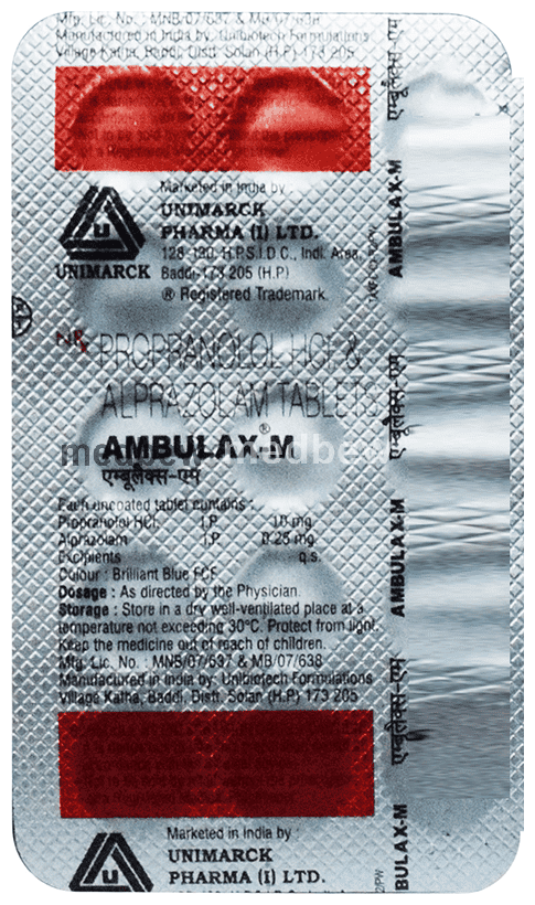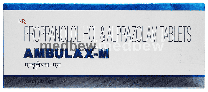 Ambulax M Tablet is a prescription medicine used to treat anxiety. It calms the brain by decreasing the abnormal and excessive activity of the nerve cells. It also blocks the action of certain chemical messengers on the heart and blood vessels. This reduces heart rate and blood pressure.