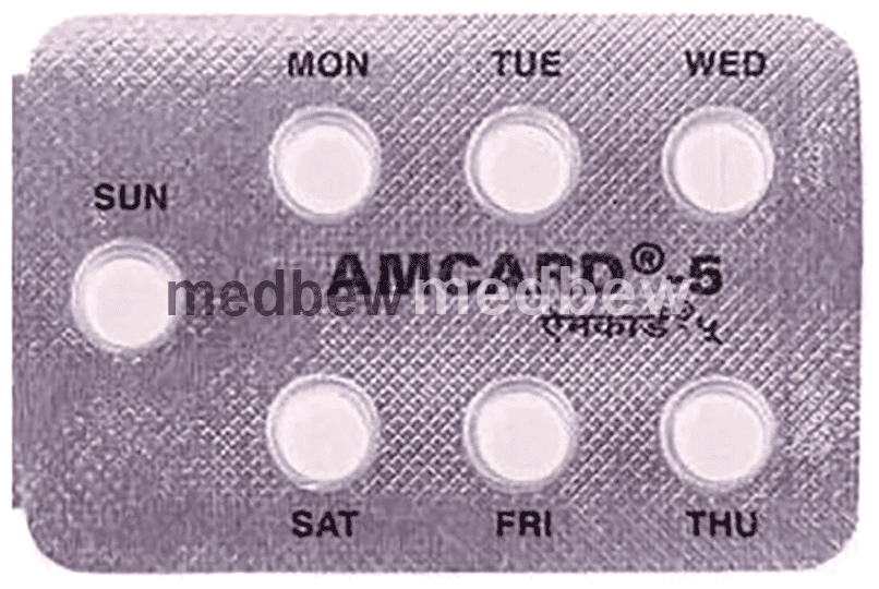 Amcard 5 Tablet may be prescribed alone or along with other medicines. The dose depends on what you are taking it for and the severity of your condition. You can take it at any time of the day, with or without food, but it is best to take it at about the same time each day. You should take this medicine for as long as it is prescribed for you. Even if you feel well, do not stop this medicine on your own because high blood pressure often has no symptoms. If you stop taking it, your condition may get worse. Keeping yourself active with regular exercise, managing your weight, and eating a healthy diet will also help control your blood pressure.
