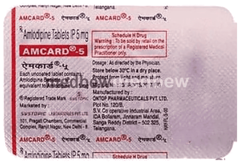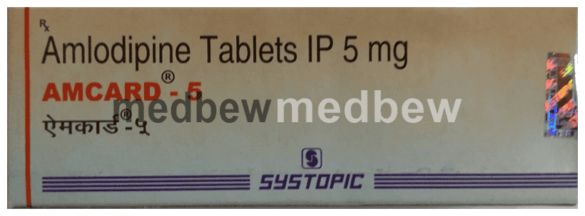 Amcard 5 Tablet belongs to a class of medicines known as calcium channel blockers. It is used to treat high blood pressure (hypertension) and prevent angina (heart-related chest pain). It lowers blood pressure and reduces the heart’s workload, which helps prevent heart attacks and strokes.