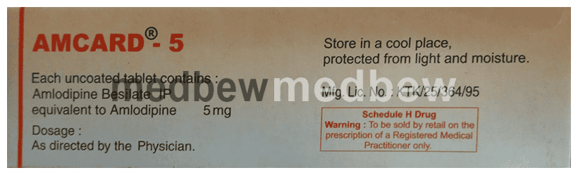 Consult your doctor first before starting any new prescription or non-prescription medicines or supplements. Take low sodium and low-fat diet, and adhere to the lifestyle changes as advised by your doctor. Avoid eating grapefruit (chakotra) or drinking grapefruit juice while taking Amcard 5 Tablet. Stop smoking and taking alcohol as this helps to lower your blood pressure and prevents heart problems.