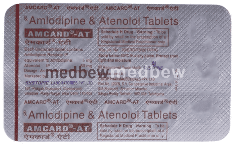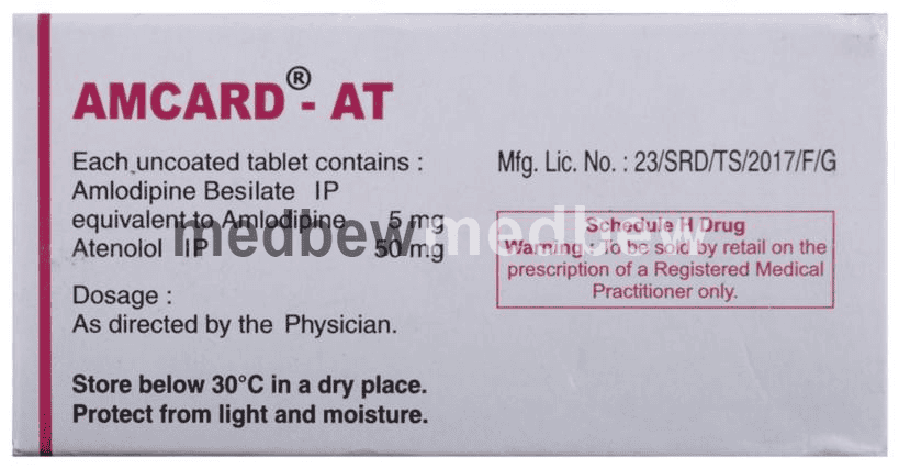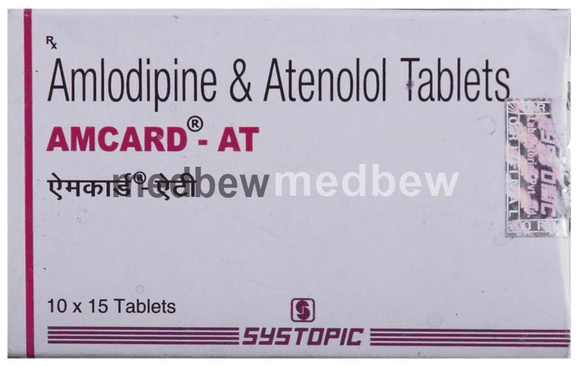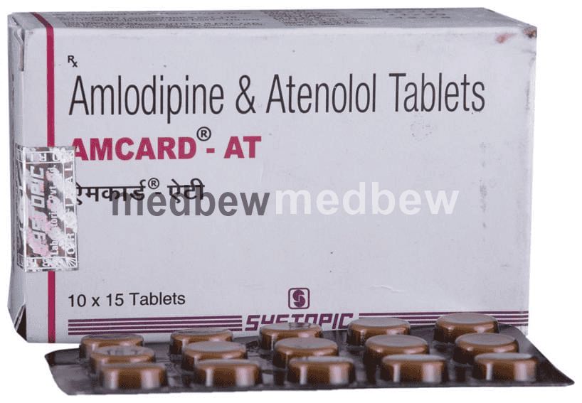 Amcard-AT Tablet is used to treat hypertension (high blood pressure). This is a combination of two medicines that controls blood pressure when a single medication is not effective. It helps to lower high blood pressure and thus reduces the chances of future heart attack and stroke.