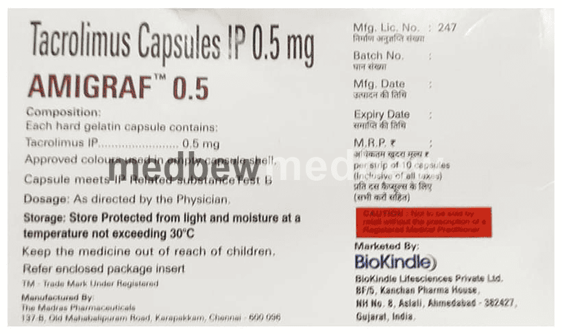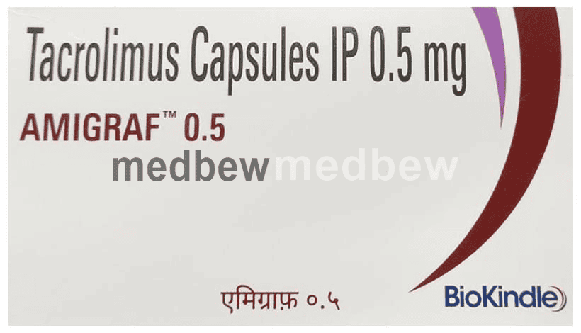 Amigraf 0.5 Capsule is used along with other medicines to prevent your body from rejecting a new organ (e.g., liver, kidney, or heart) after transplant. It does so by weakening your body’s immune system, so it does not attack the new organ. This medication belongs to a class of drugs known as immunosuppressants. The amount of