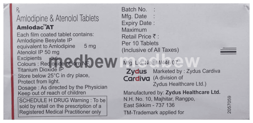 Amlodac AT Tablet is used to treat hypertension (high blood pressure). This is a combination of two medicines that controls blood pressure when a single medication is not effective. It helps to lower high blood pressure and thus reduces the chances of future heart attack and stroke.