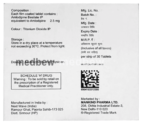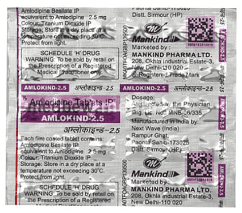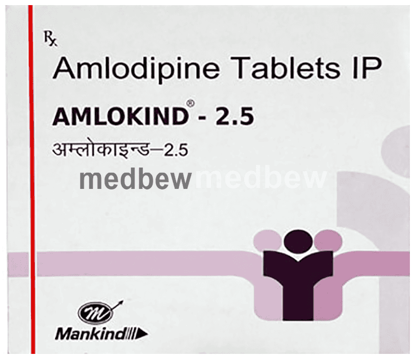 Amlokind 2.5 Tablet belongs to a class of medicines known as calcium channel blockers. It is used to treat high blood pressure (hypertension) and prevent angina (heart-related chest pain). It lowers blood pressure and reduces the heart’s workload, which helps prevent heart attacks and strokes.