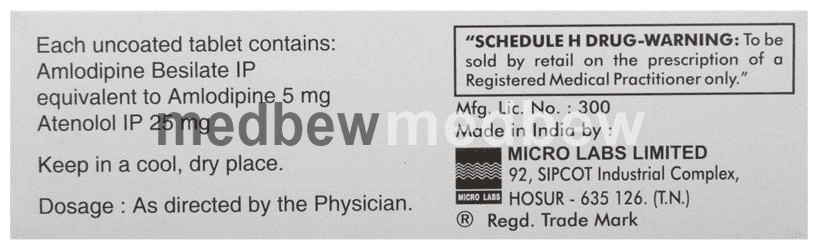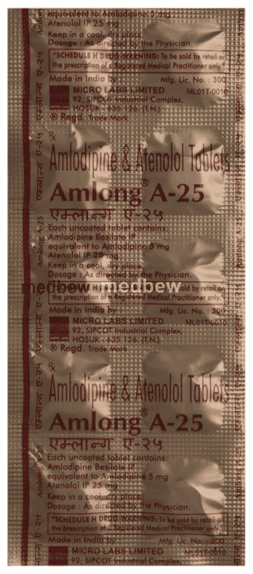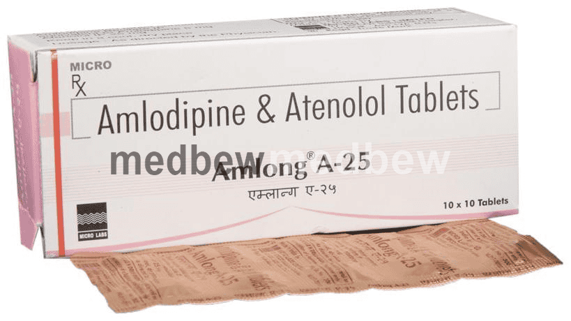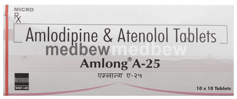 Amlong A-25 Tablet is used to treat hypertension (high blood pressure). This is a combination of two medicines that controls blood pressure when a single medication is not effective. It helps to lower high blood pressure and thus reduces the chances of future heart attack and stroke.