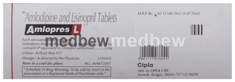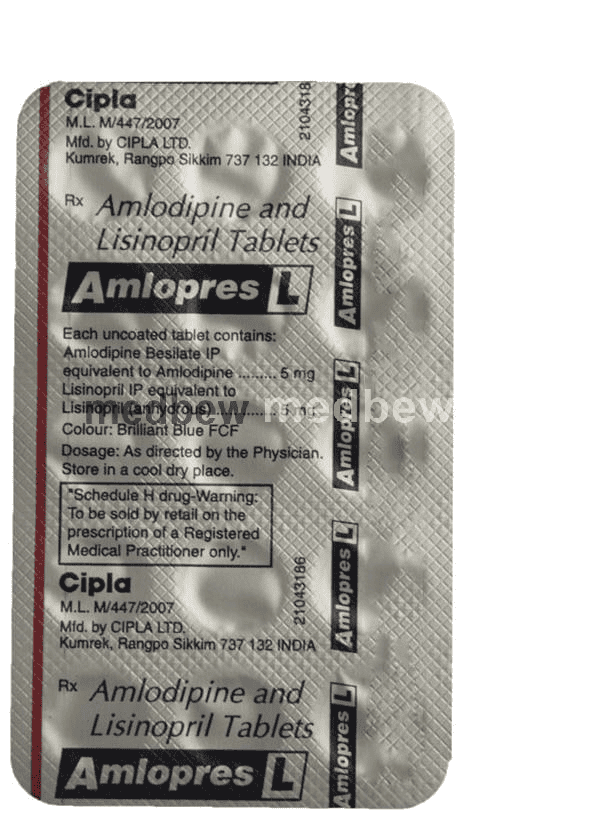 Amlopres L Tablet is used to treat hypertension (high blood pressure). This is a combination of two medicines that controls blood pressure when a single medication is not effective. It helps to lower high blood pressure and thus reduces the chances of future heart attack and stroke.