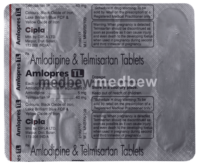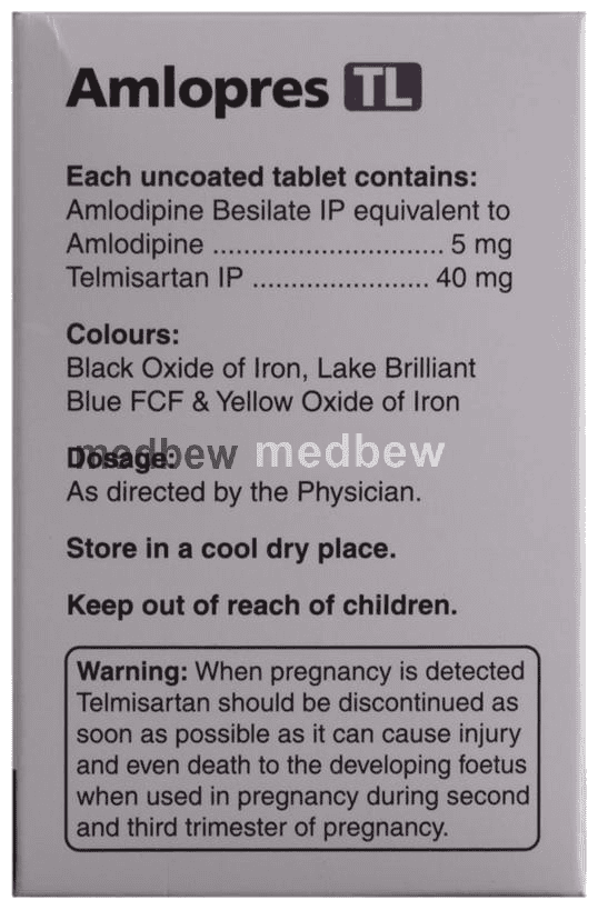 Amlopres TL Tablet contains two medicines, both of which help to control high blood pressure. It lowers the blood pressure by relaxing the blood vessels and making it easier for your heart to pump blood around your body. This will reduce your risk of having a heart attack or a stroke.