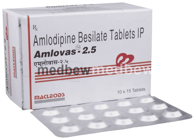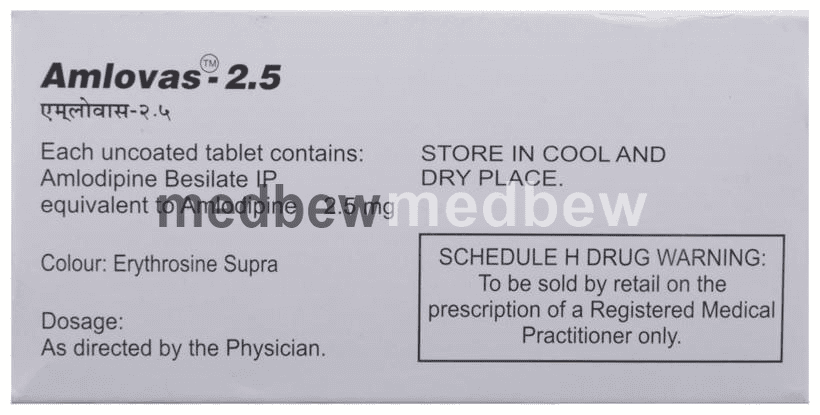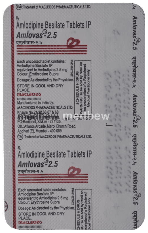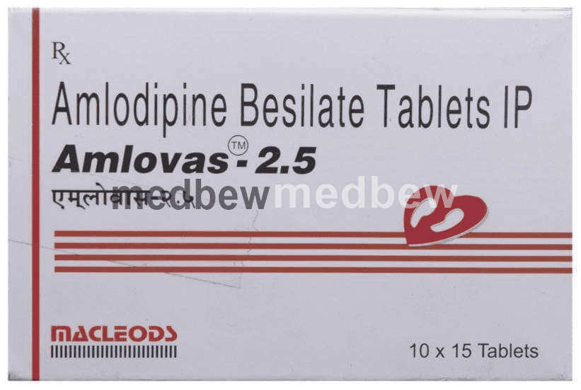 Amlovas 2.5 Tablet belongs to a class of medicines known as calcium channel blockers. It is used to treat high blood pressure (hypertension) and prevent angina (heart-related chest pain). It lowers blood pressure and reduces the heart’s workload, which helps prevent heart attacks and strokes.