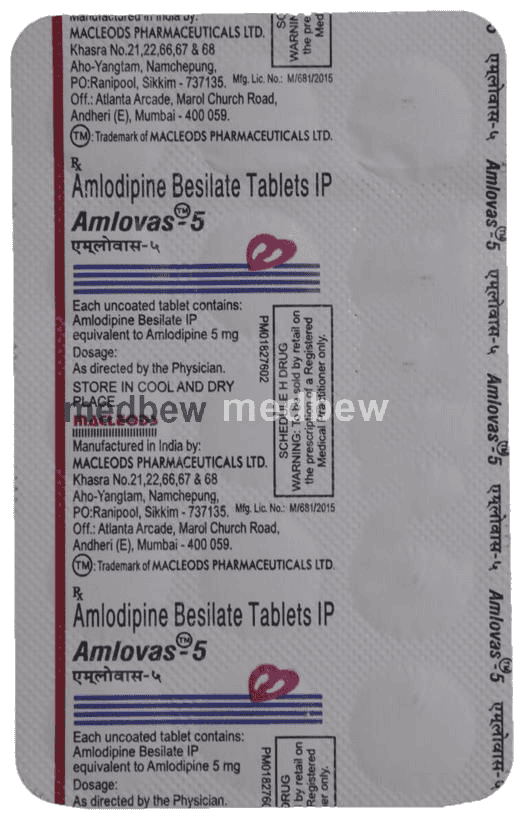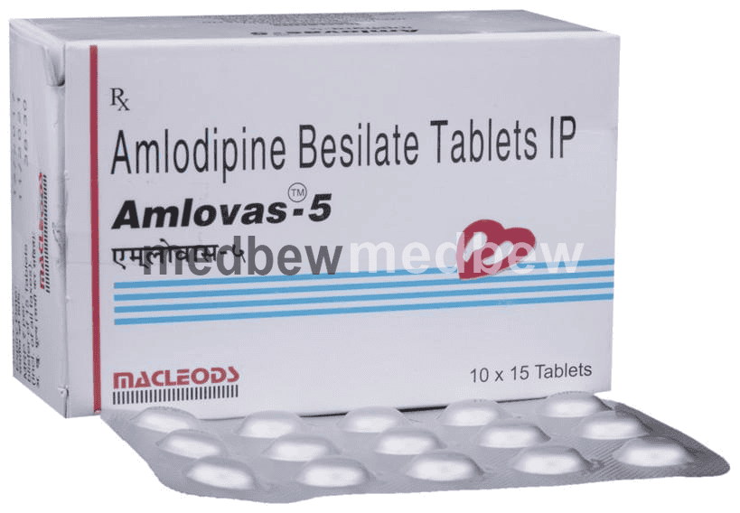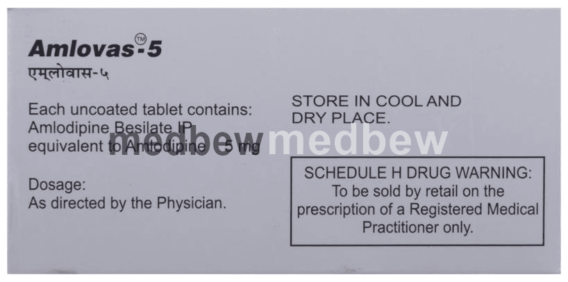 Amlovas 5 Tablet belongs to a class of medicines known as calcium channel blockers. It is used to treat high blood pressure (hypertension) and prevent angina (heart-related chest pain). It lowers blood pressure and reduces the heart’s workload, which helps prevent heart attacks and strokes.