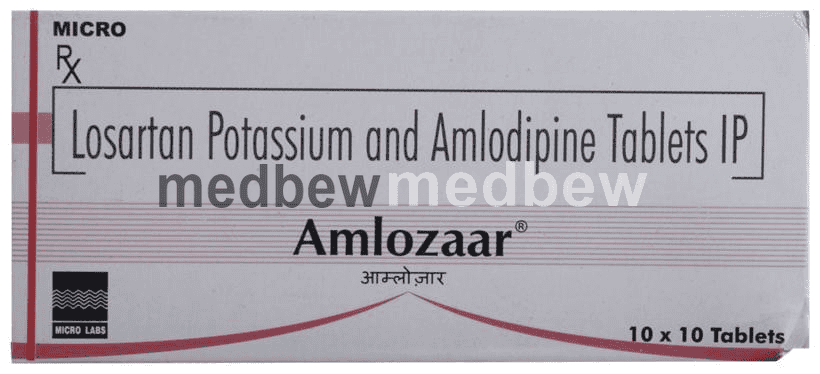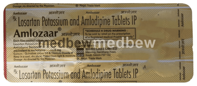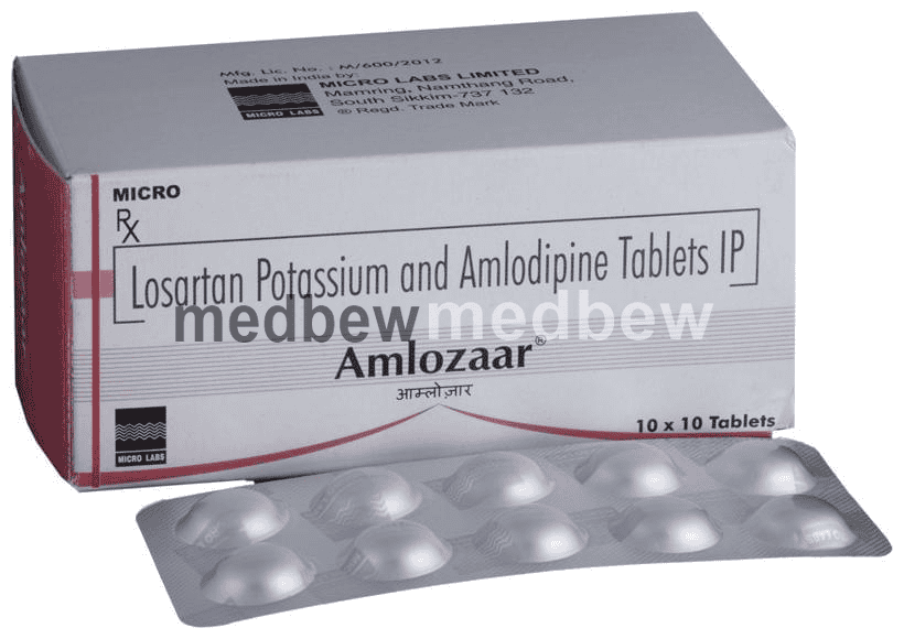 Amlozaar Tablet contains two medicines, both of which help to control high blood pressure. It lowers the blood pressure by relaxing the blood vessels and making it easier for your heart to pump blood around your body. This will reduce your risk of having a heart attack or a stroke.