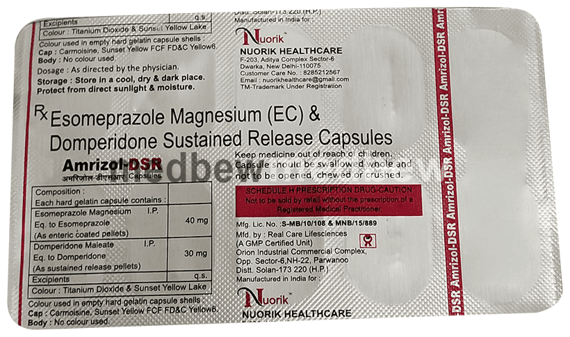 Amrizol-DSR Capsule is a prescription medicine used to treat gastroesophageal reflux disease (Acid reflux) and indigestion by relieving the symptoms such as heartburn, stomach pain, or irritation. It also neutralizes the acid in the stomach and promotes easy passage of gas to reduce stomach discomfort.