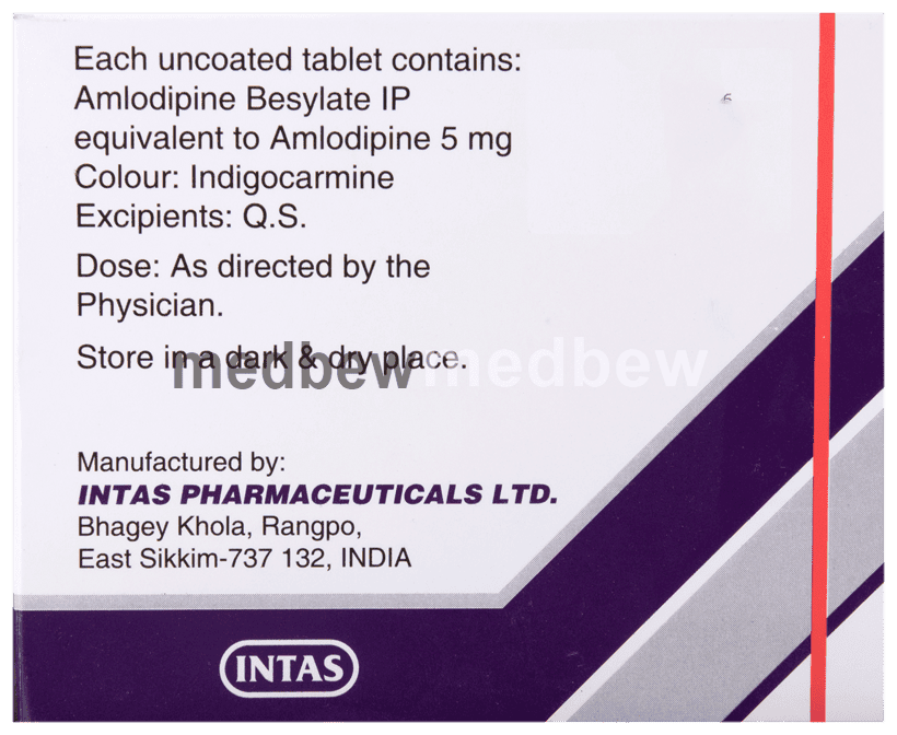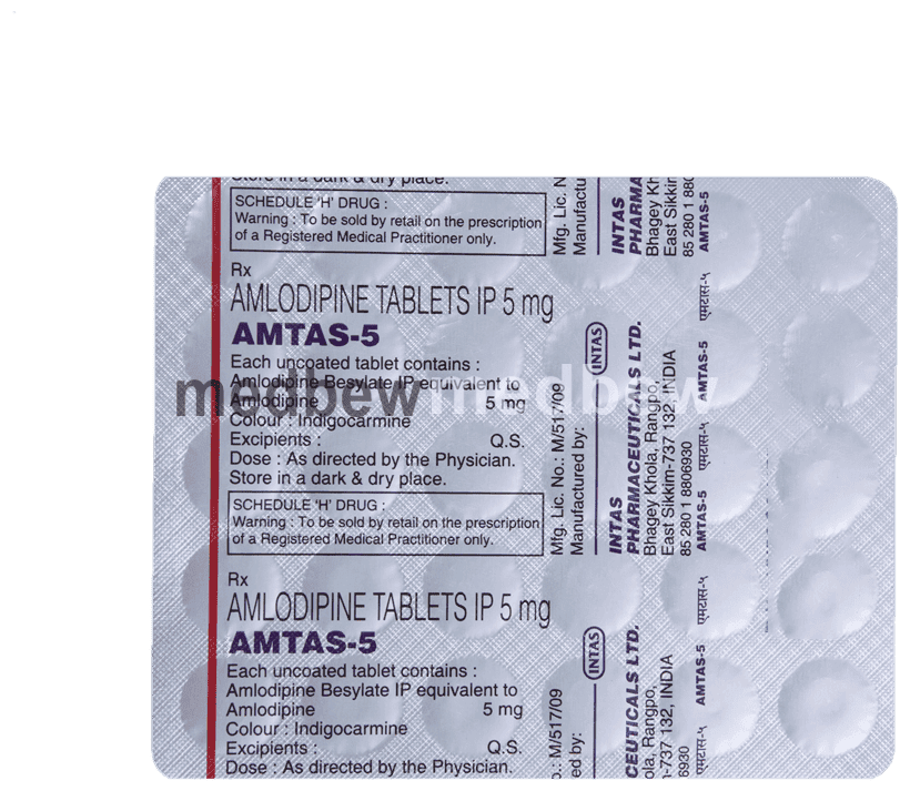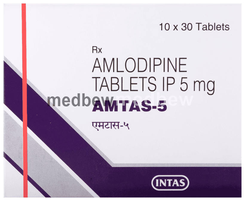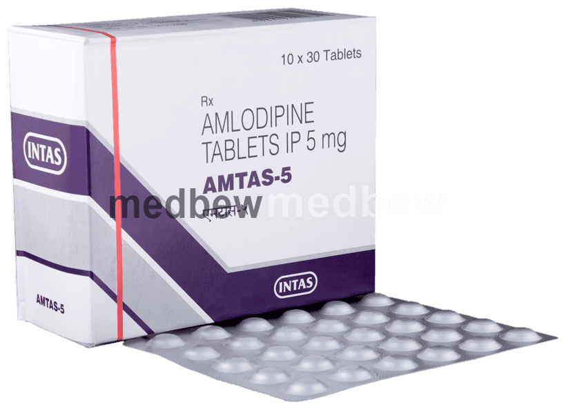 Amtas 5 Tablet belongs to a class of medicines known as calcium channel blockers. It is used to treat high blood pressure (hypertension) and prevent angina (heart-related chest pain). It lowers blood pressure and reduces the heart’s workload, which helps prevent heart attacks and strokes.