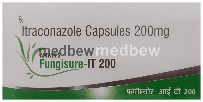 Amwin’s Fungisure-IT 200 Capsule belongs to a group of medicines called antifungals. It works by stopping the growth of fungi and is used to treat infections of the mouth, throat, vagina, and other parts of the body including fingernails and toenails. It kills fungi by destroying the fungal cell membrane.