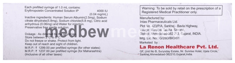 Composition Recombinant Human Erythropoietin Alfa (4000IU)