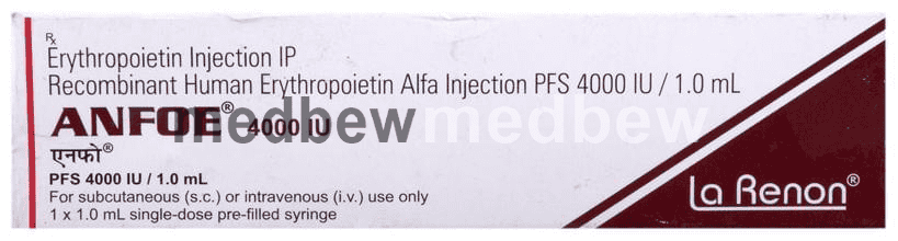 Anemia is a condition where your body does not have enough red blood cells to carry oxygen around your body. Anfoe 4000IU Injection is a man-made protein that works by stimulating the bone marrow (soft tissue inside the bones) to produce more red blood cells. The natural human form of this protein may be reduced when you are having chemotherapy to treat some types of cancer. An injection of the medicine can reduce the need to have a blood transfusion. You may also be given iron supplements to make the treatment more effective.show moreshow less