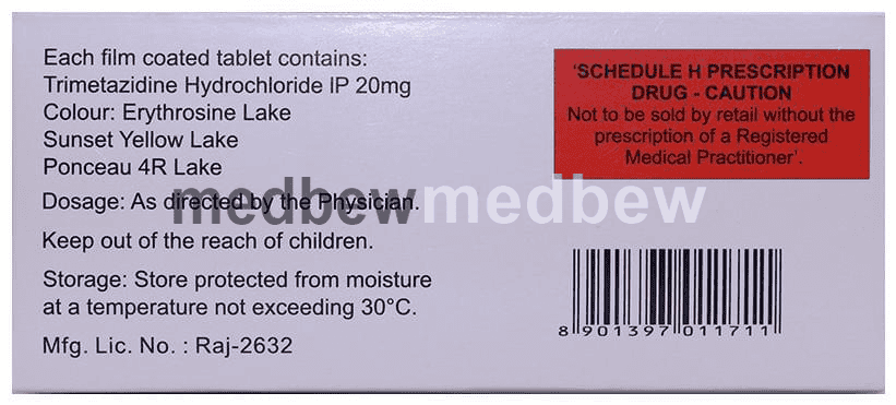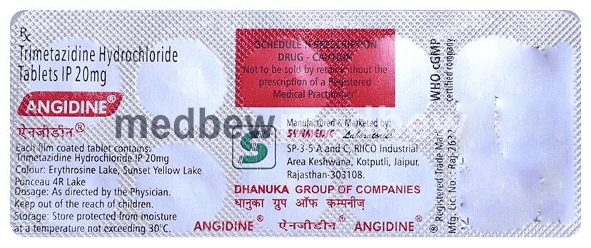 Angidine Tablet is an anti-anginal medication. It decreases the oxygen requirement of the heart by shifting its metabolism from fats to glucose. As a result, the heart works more efficiently.