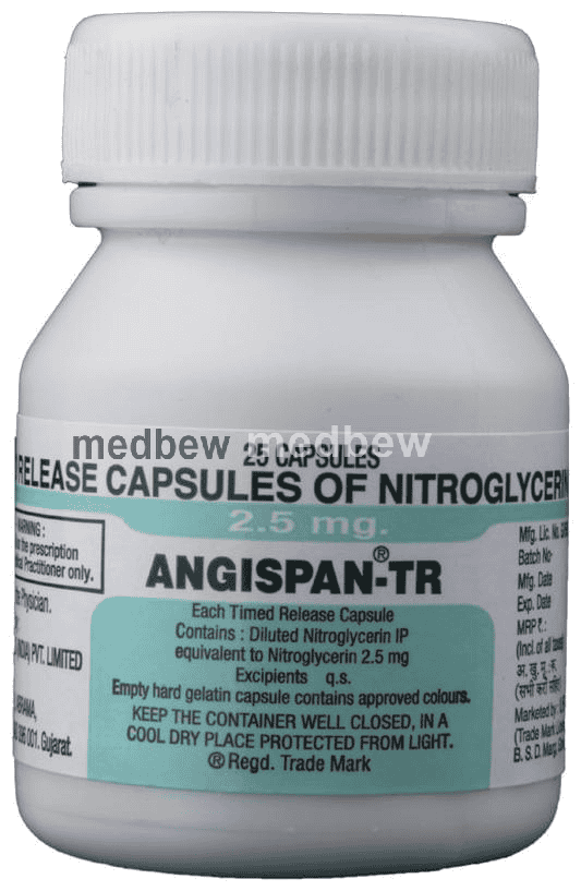 Angispan – TR 2.5mg Capsule is used to treat and prevent heart-related chest pain (angina). Angina occurs when the heart muscle is not getting enough blood. This medicine works by relaxing and widening blood vessels so blood can flow more easily to the heart.