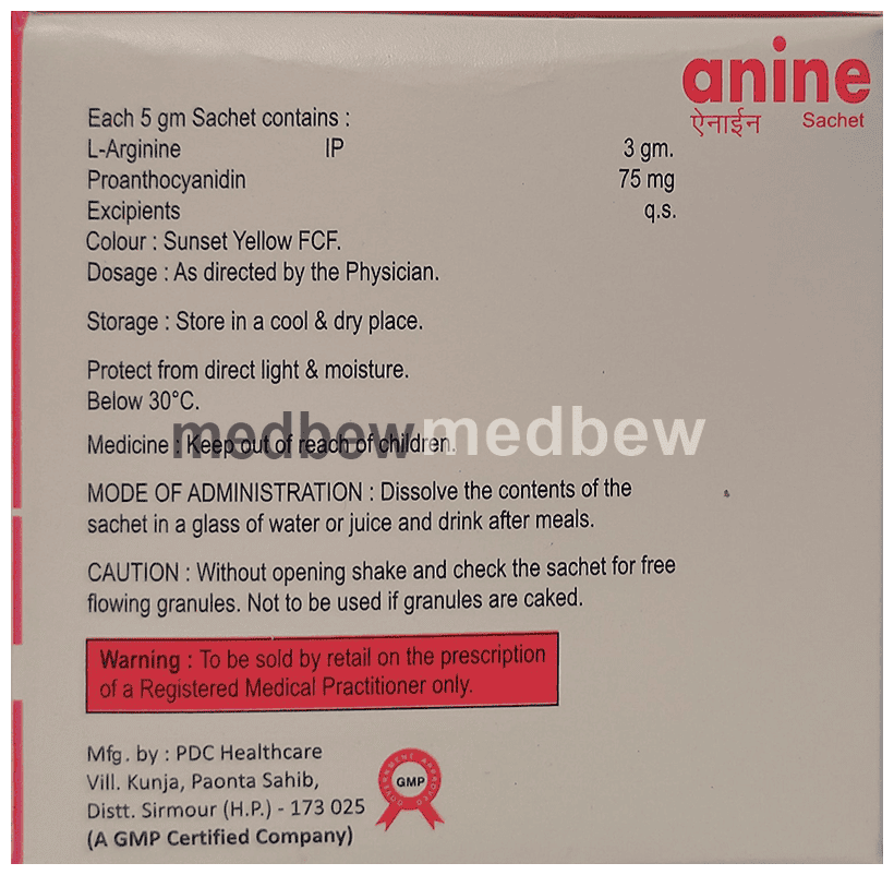 Anine Sachet Orange Sugar Free is a combination of two nutritional supplements. L-Arginine is a naturally occurring compound that provides proper nutrition for adequate growth and development. Proanthocyanidin is an extract from grape seeds that increases the strength of the blood vessels in people with hypertension and diabetes.