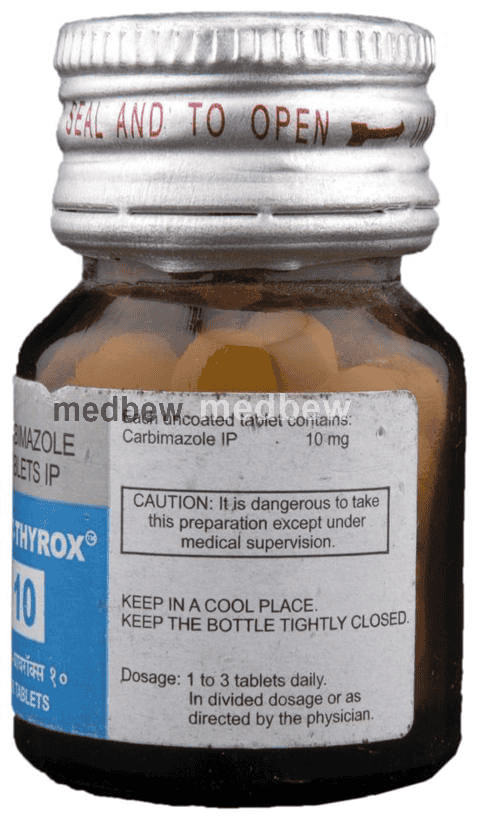 Anti-Thyrox 10 Tablet reduces the amount of thyroid hormone in your body and also helps relieve the symptoms of hyperthyroidism. These include palpitations, feeling anxious, sweaty or shaky, and being intolerant to heat. This will help you have a better quality of life. Keep taking it as advised by the doctor to get maximum benefit.