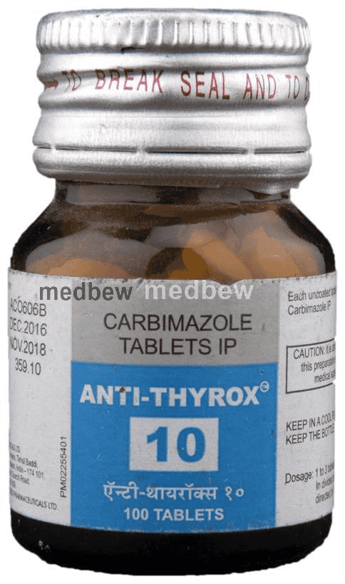 Anti-Thyrox 10 Tablet belongs to a group of medicine called anti-thyroid agents. It is used in the treatment of hyperthyroidism. It reduces the amount of thyroid hormones produced by the thyroid gland.