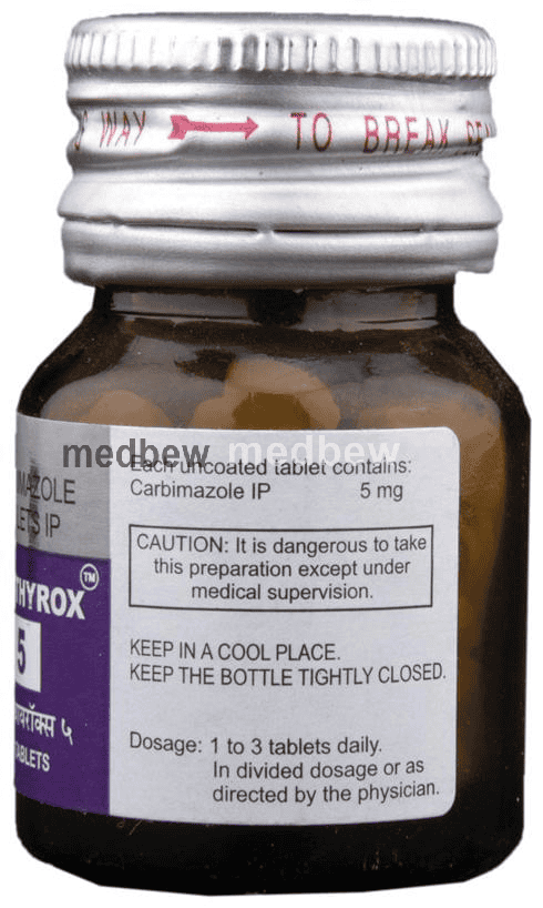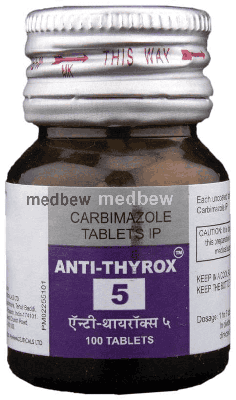 Anti-Thyrox 5 Tablet is an anti-thyroid medication. It works by reducing the amount of thyroid hormones produced by the thyroid gland.