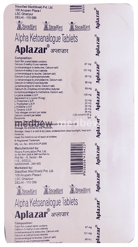Aplazar Tablet belongs to a class of drugs called nutritional supplements. It provides nutrition therapy in the patients of chronic kidney failure. This medicine prevents the unnecessary increase in urea levels in the blood.
