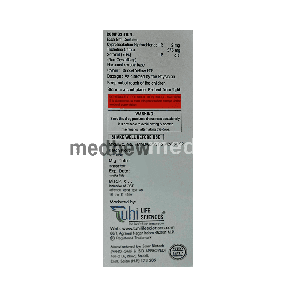 Composition Cyproheptadine (2mg/5ml) + Tricholine Citrate (275mg/5ml) + Sorbitol (70%)