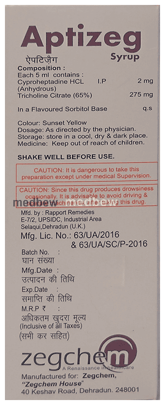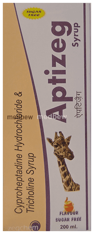 Aptizeg Syrup Orange Sugar Free is a combination of two medicines: Cyproheptadine and tricholine citrate which revives appetite. Cyproheptadine is an appetite stimulant. It works by reducing the effect of serotonin (a chemical messenger) in the hypothalamus, a part of the brain which regulates appetite. Tricholine citrate is a bile acid binding agent. It removes bile acids from the body. The liver then produces more bile acids using cholesterol, as a result, the level of cholesterol in the body is lowered.