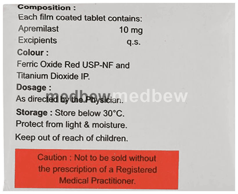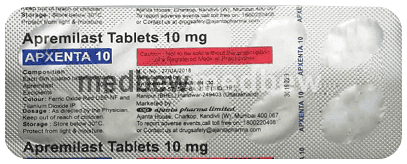 Apxenta 10 Tablet is used to treat plaque psoriasis (red, scaly, thick, itchy, painful patches on skin) and psoriatic arthritis (a condition that causes joint pain and swelling). It is a long-term treatment and may take about 16 weeks to show an improvement.