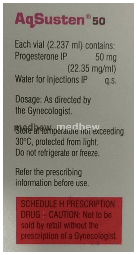 Aqsusten 50 Injection is a progesterone (female hormone). It works on the lining of the uterus and helps to establish and maintain pregnancy in infertile women. It helps in protecting the uterus from the negative effects of oestrogen when used for the treatment of postmenopausal symptoms.