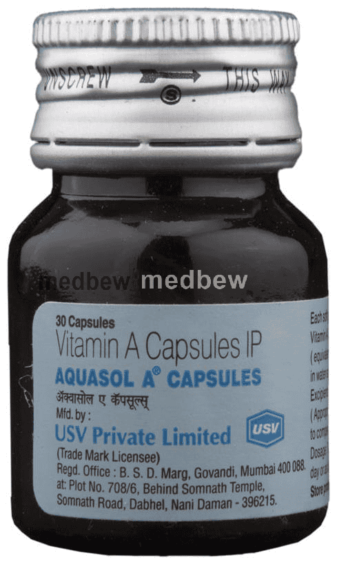 Aquasol A Capsule is a supplement of vitamin A. It is used to treat conditions caused by low levels of vitamin A in the body. Vitamin A is an essential nutrient that helps the body to perform various functions. Vitamin A is essential for good vision, healthy skin, cell growth, and a healthy immune system. It also helps the heart, lungs, kidneys, and other organs function properly.