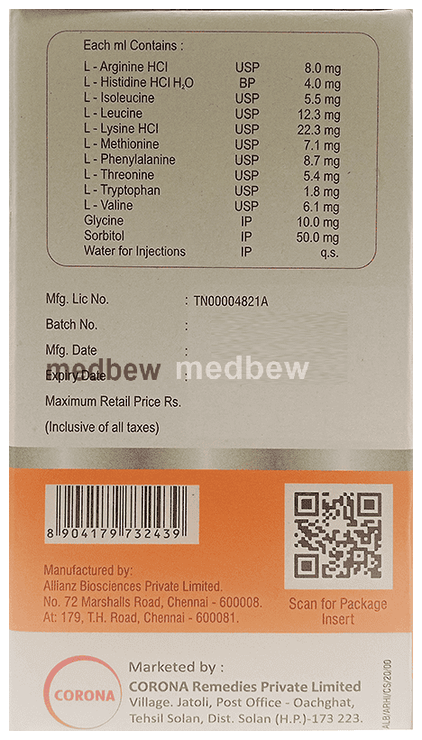 Argihope Infusion contains amino acids that are very important for the normal growth and development of muscles, connective tissue, and skin. They help in maintaining muscle tone and strength. They have a major role in the generation of energy in our body, regulation of mood, healing and repair of damaged tissues and keeping our skin, nails and hair healthy. Follow your doctorโs instructions carefully to get the most benefit.