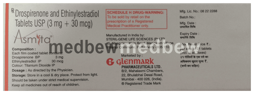 Asmita Tablet is a combined oral contraceptive pill. It works by preventing the release of egg (ovulation) and affecting sperm movement in the womb to prevent its union with the egg. It also changes the lining of the womb and renders it unsuitable for pregnancy.
