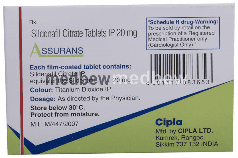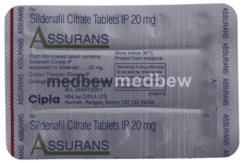 Assurans Tablet is a phosphodiesterase (PDE-5) inhibitor. It works by relaxing the blood vessels in your lungs thereby reducing the high blood pressure in the lungs. This allows your heart to work less to pump blood in your lungs.