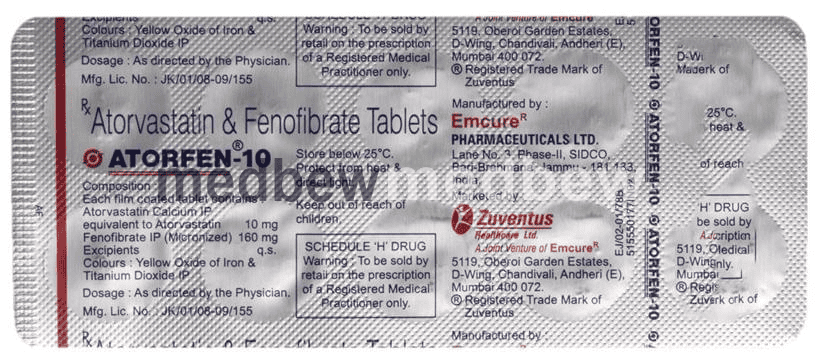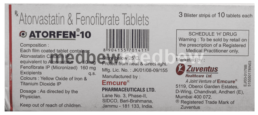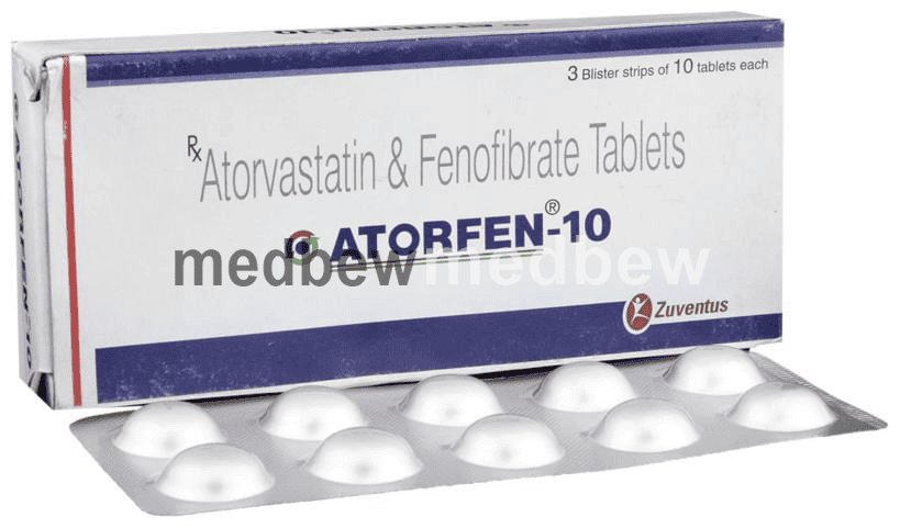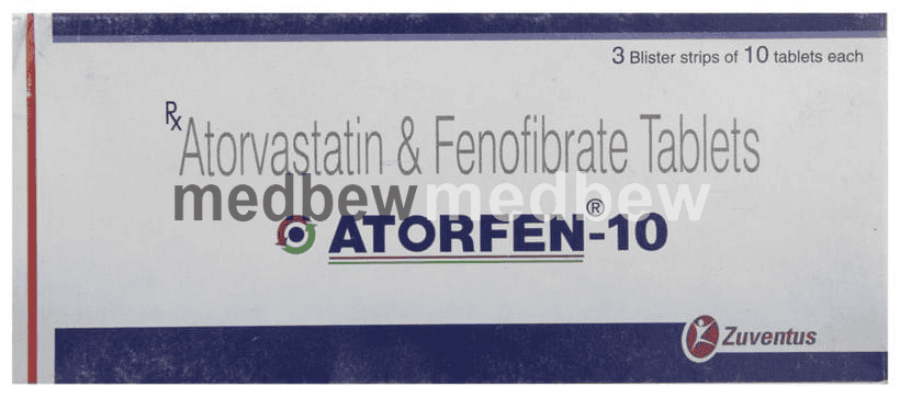 Atorfen 10 Tablet is a combination of two lipid (fat) lowering medicines. It is used to lower the levels of lipids known as cholesterol and triglycerides in the blood when lifestyle changes (eg. low-fat diet) on their own have failed. This medicine helps to reduce the risk of heart disease.