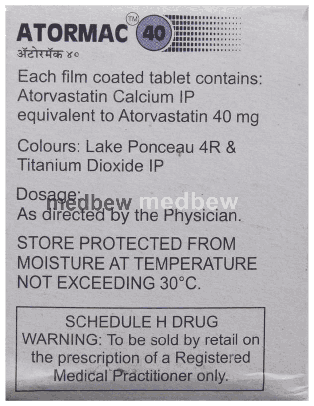 Atormac 40 Tablet belongs to a group of medicines known as statins, which lowers the level of lipids or fats. Atormac 40 Tablet is used to lower lipids known as cholesterol and triglycerides in the blood when a low-fat diet and lifestyle changes fail to lower the levels of cholesterol and triglycerides. If you are at an increased risk of heart disease, Atormac 40 Tablet can also be used to reduce such risk even if your cholesterol levels are normal. You should maintain a standard cholesterol-lowering diet during treatment.