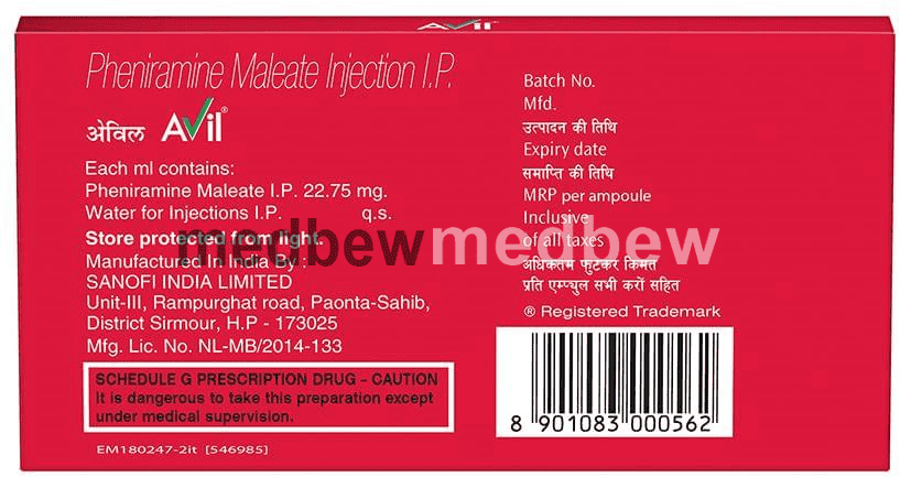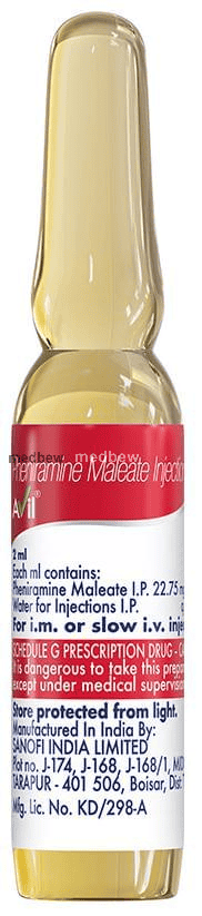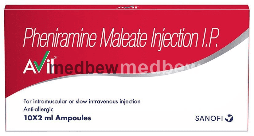 Avil Injection is an antiallergic medication. It is used to treats symptoms of allergic conditions caused by insect bites/stings, certain medicines, or hives (rashes, swelling, etc.).