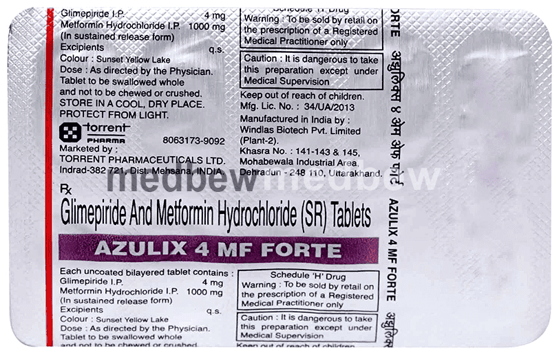 Azulix 4 MF Forte Tablet PR belongs to a category of medicines known as anti-diabetic drugs. It is a combination of two medicines used to treat type 2 diabetes mellitus in adults. It helps control blood sugar levels in people with diabetes.