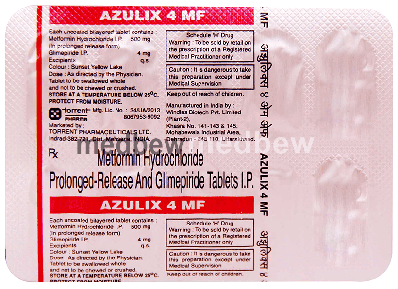 Azulix 4 MF Tablet PR belongs to a category of medicines known as anti-diabetic drugs. It is a combination of two medicines used to treat type 2 diabetes mellitus in adults. It helps control blood sugar levels in people with diabetes.