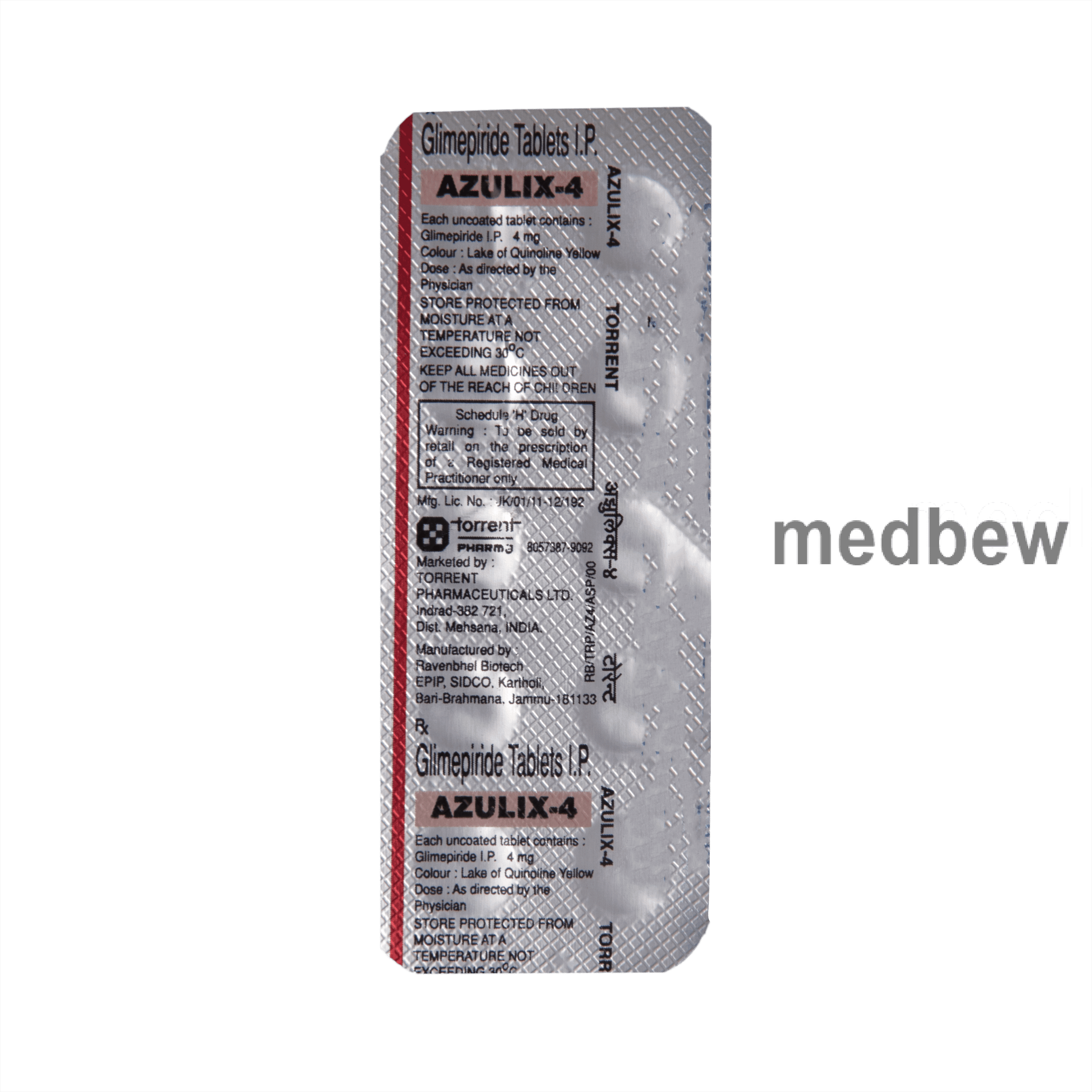 Azulix 4 Tablet belongs to a group of medicines called sulfonylureas and is used to treat type 2 diabetes mellitus in adults. It helps control blood sugar levels in people with diabetes thereby preventing serious complications of diabetes such as kidney damage and blindness.