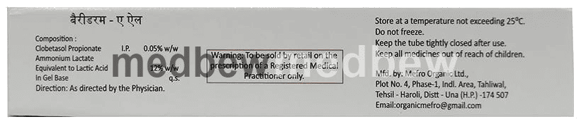 Bariderm-AL Gel is a combination medicine that is used to treat various types of skin infections. It minimizes symptoms of inflammation such as redness, swelling, and itching. It also moisturizes the skin and relieves the skin from minor irritations.