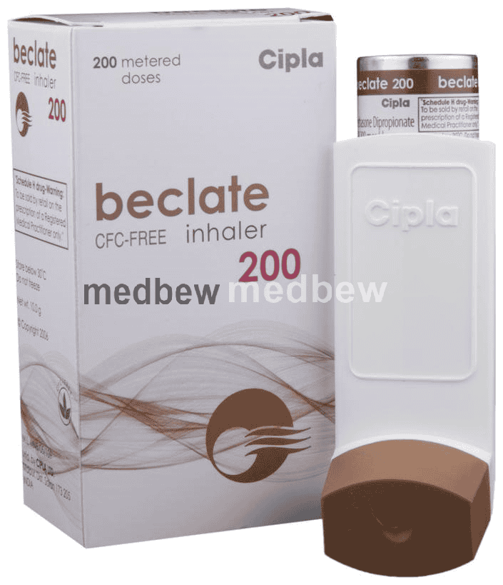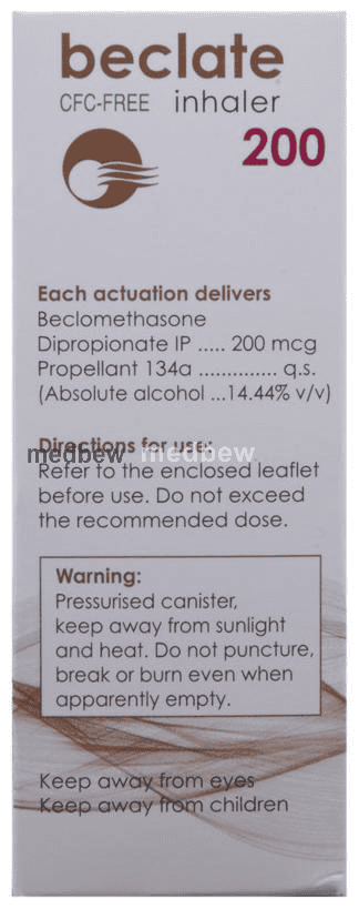 Beclate 200 CFC Free Inhaler belongs to a group of medicines called steroids. It is used in the prevention and treatment of asthma. When inhaled, it suppresses the inflammation in the lungs and airway passage, widening the airway to make breathing easier.
