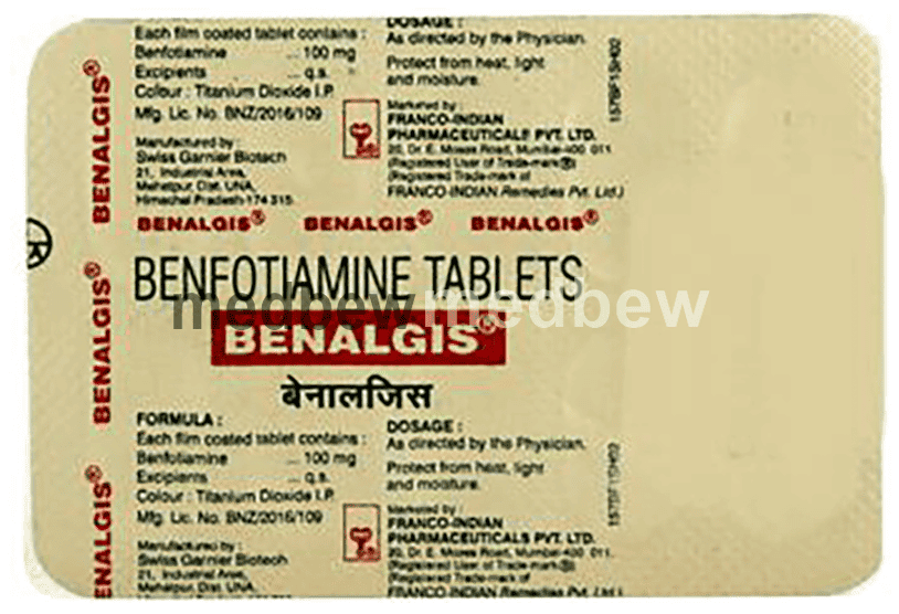 Benalgis Tablet is a dietary supplement of thiamine (vitamin B1). It is used in the treatment of nutritional deficiencies caused by low levels of thiamine in the body. It protects the body from conditions caused due to low levels of thiamine such as heart and nerve disorders.