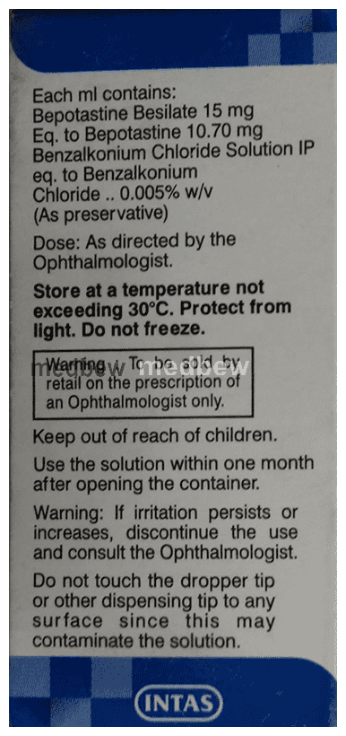 Bepodrops Ophthalmic Solution belongs to a group of medicines called antihistamines. It is used in the treatment of itching asssociated with inflammation in the eyes (redness and swelling) caused due to allergy.